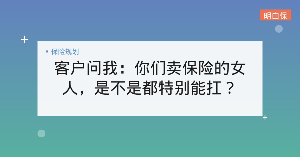客户问我:你们卖保险的女人,是不是都特别能扛? 一个卖了8年保险的女代理人,聊聊入行初衷、遭遇的挫折与成长。用真实经历回答“女性是否更适合做保险”,并分享给新人的真诚建... 📅 2026-04-17 👁 3 📁 保险知识, 投保指南