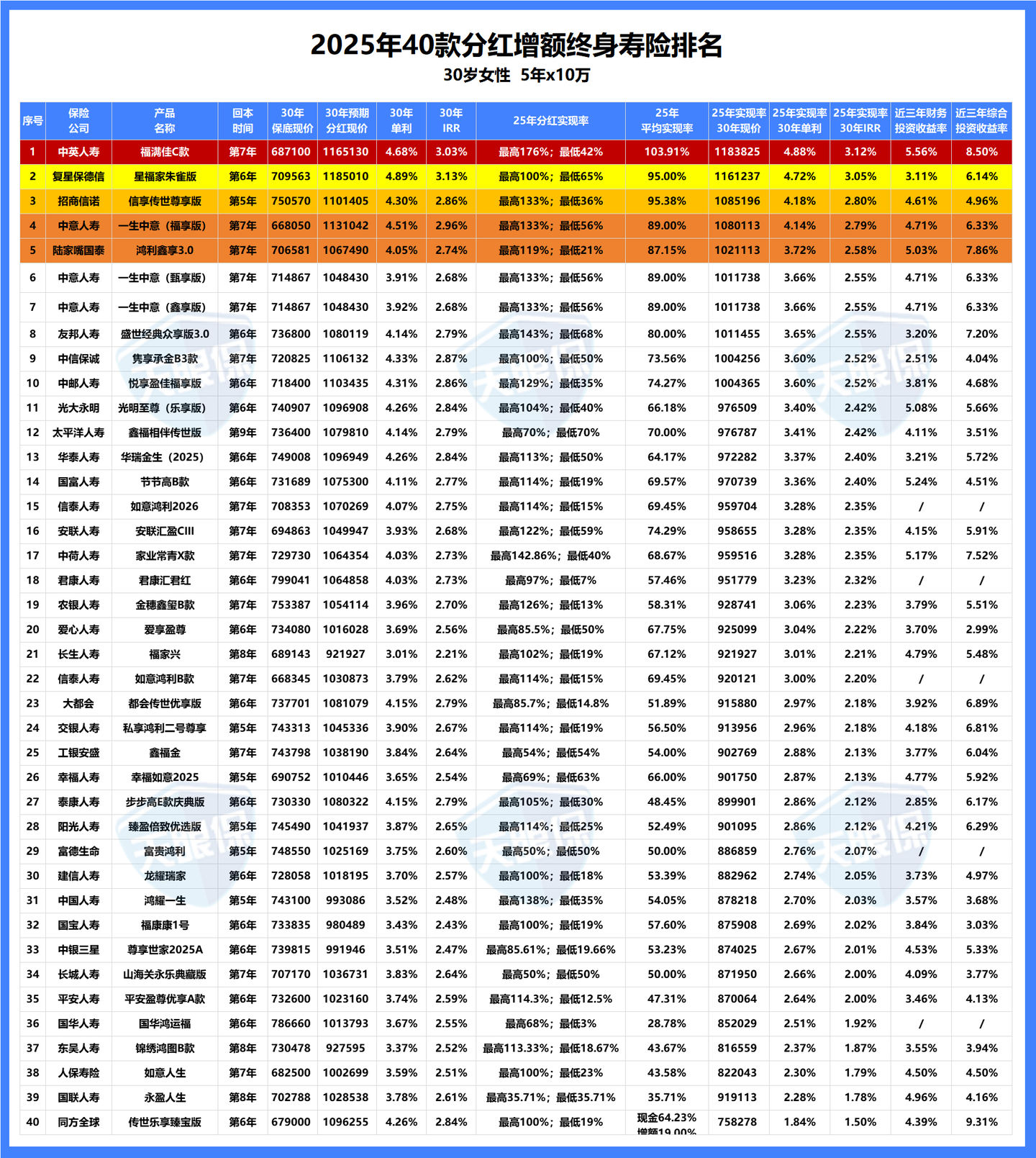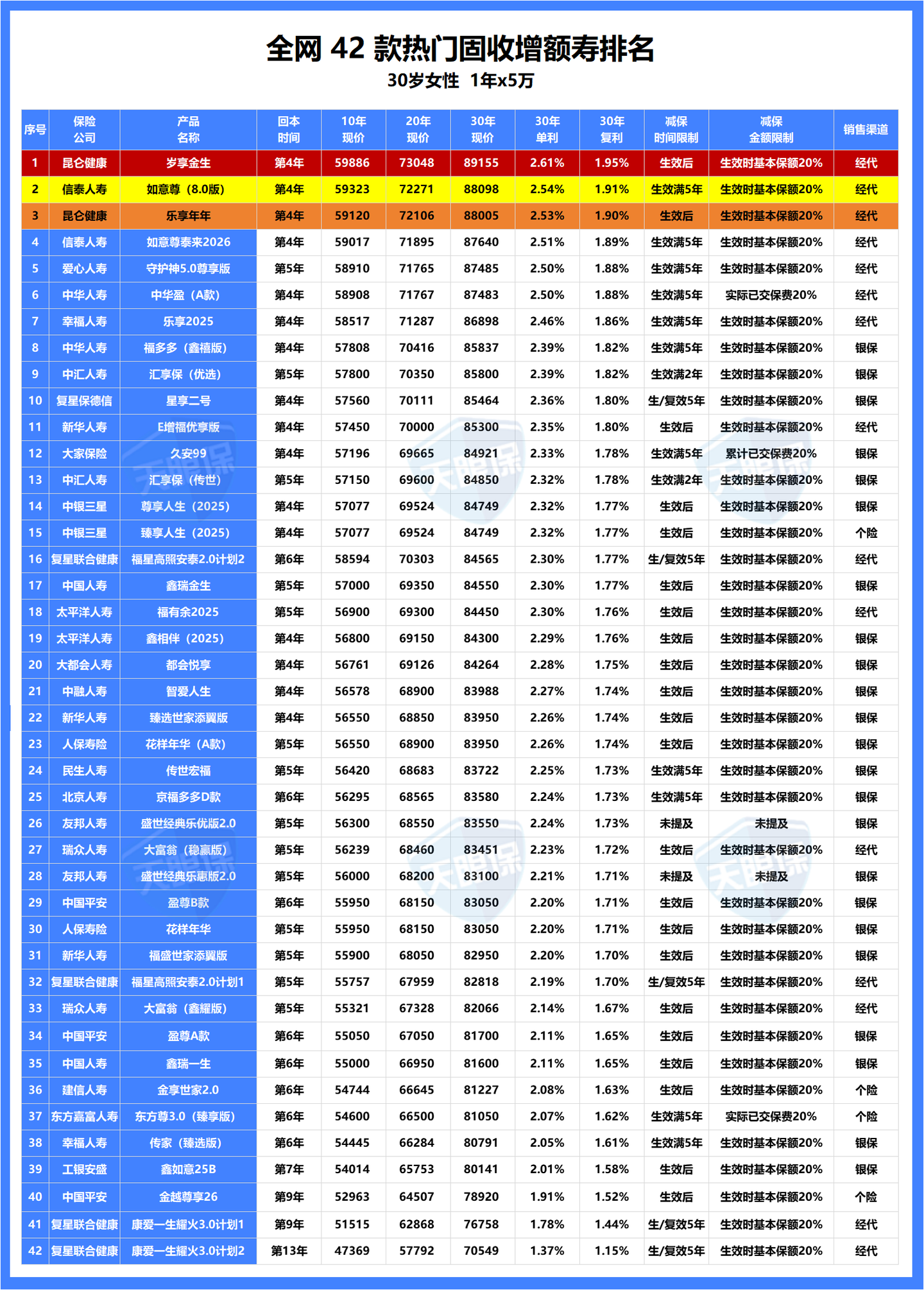 我把42款产品,根据收益高低,重新做了排序,一起来看;以30岁女性,一次性交5万为例,排名前5的产品为: