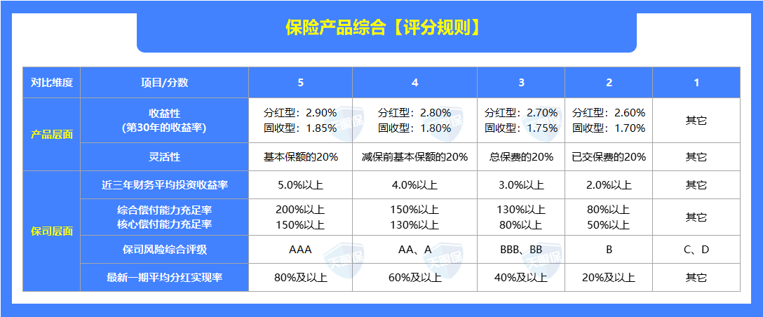 打分规则:根据收益的高低、灵活性的宽松程度,保险公司的实力强弱共分为 5 个档次,最低档次得1分,然后逐个档次加1分。