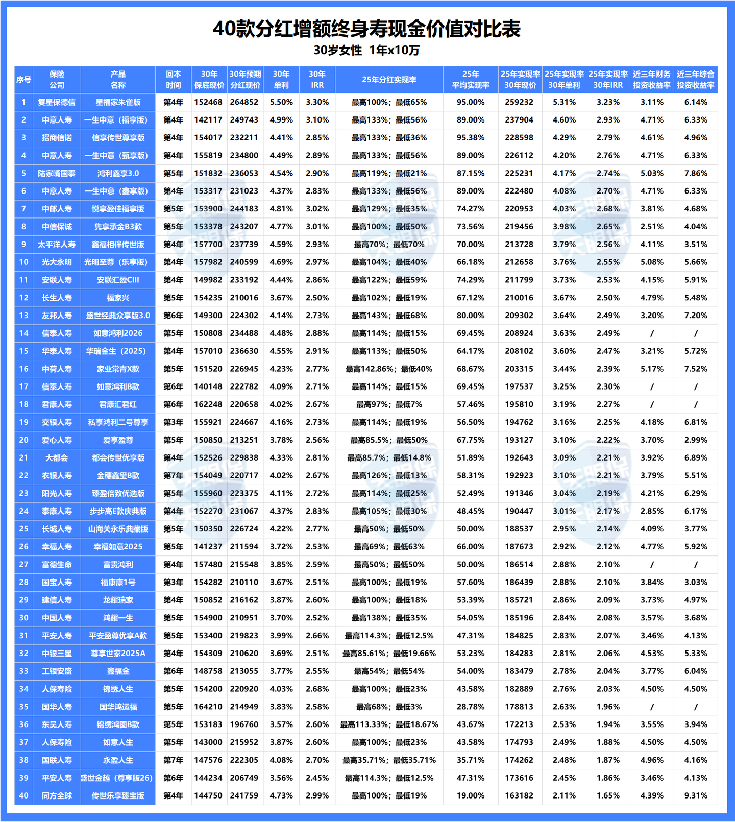 ② 收益天花板,如果按25年平均分红实现率来排序,中英福满佳C款遥遥领先,以30岁女性,每年投入10万,投入5年为例;第30年的现金价值能达到118万,IRR为3.12%;而排名第二的星福家朱雀版也只有3.05%。