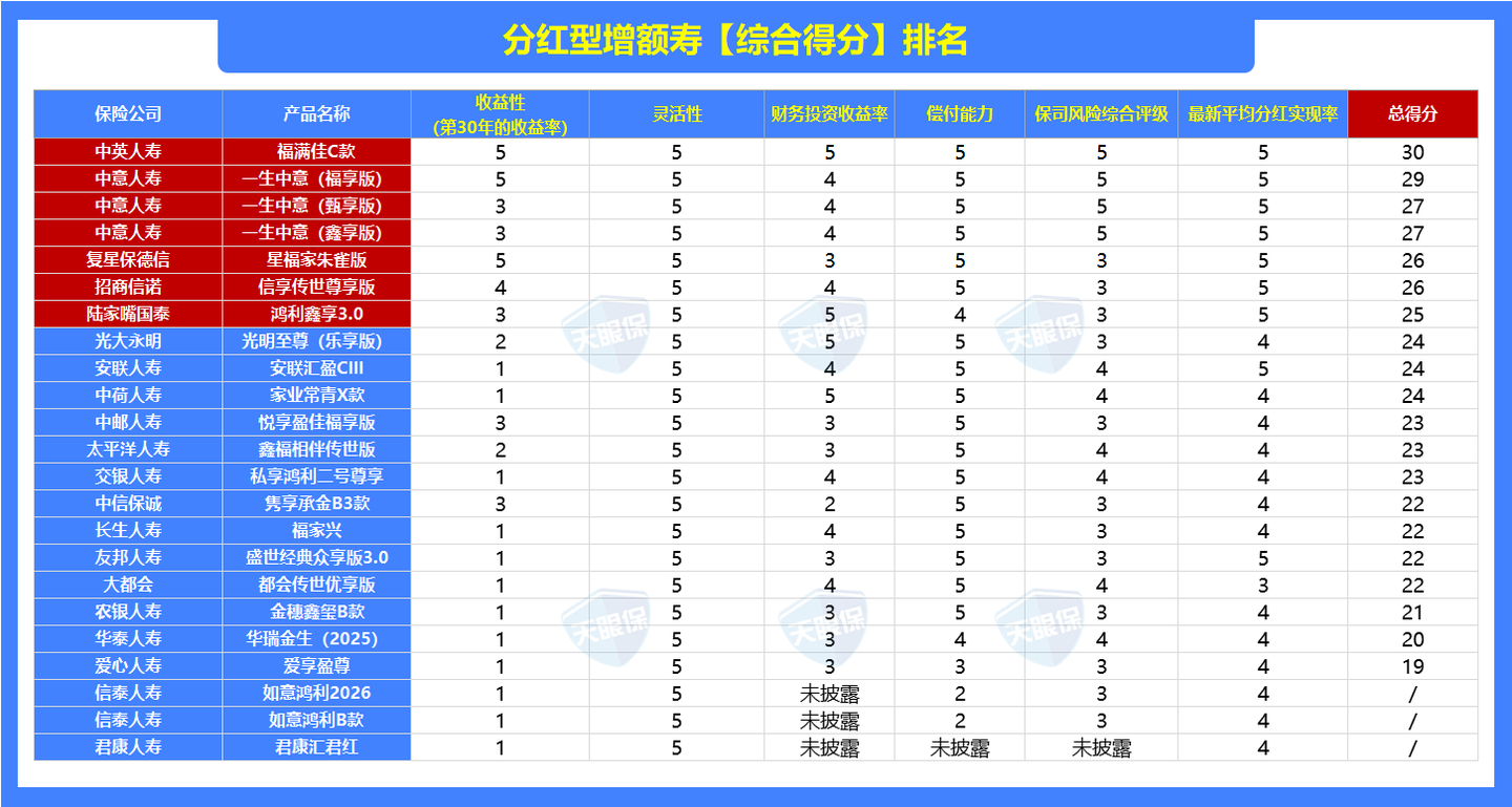 根据上面制定的评分规则,综合对比市场上热门分红型增额寿,分数从高到低排名如下: