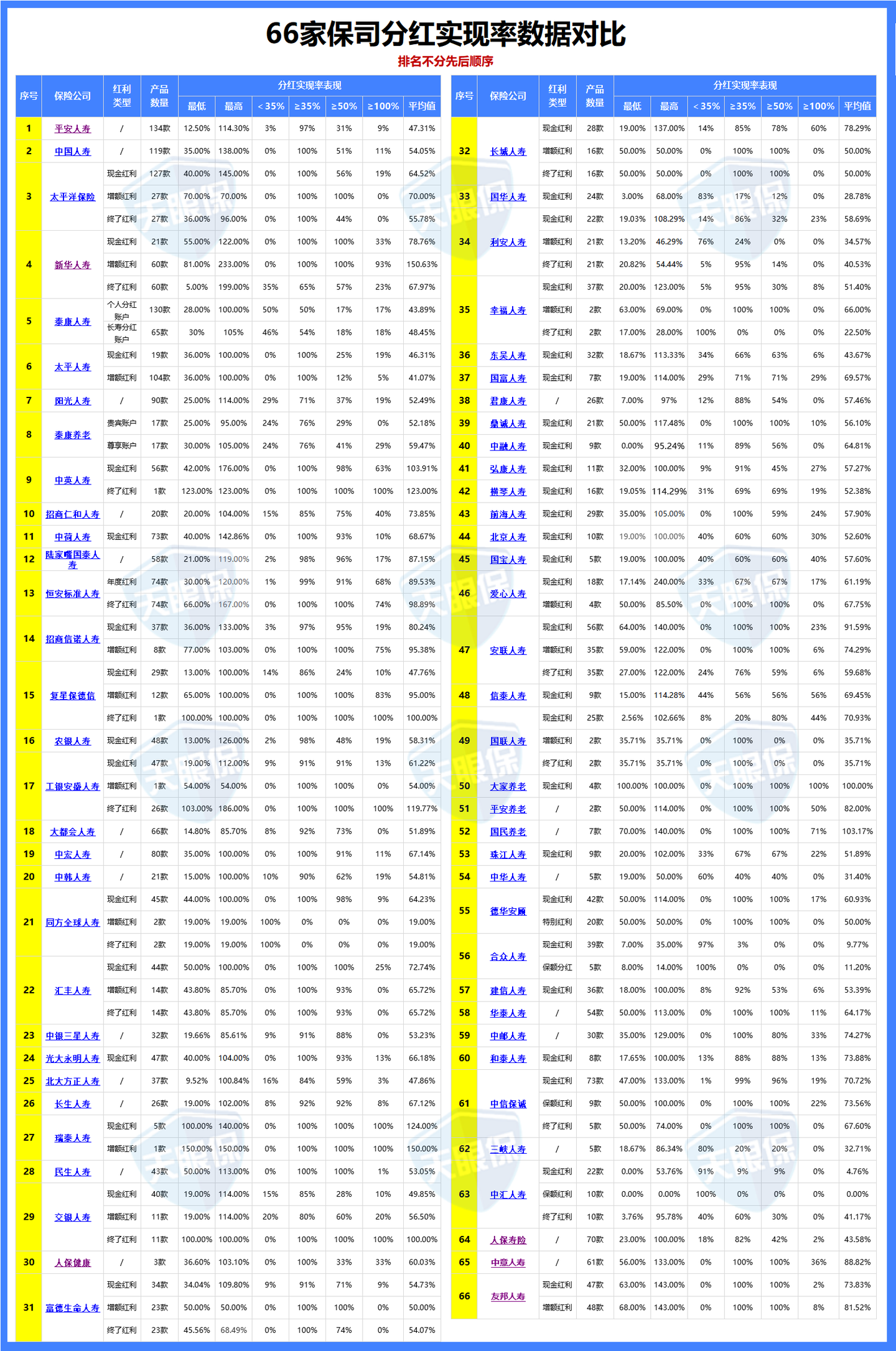 但今年最新的分红实现率,各家公司也陆续公布了,分红水平都有大幅提升;也汇总了已经公布的 66 家保险公司,一起来看: