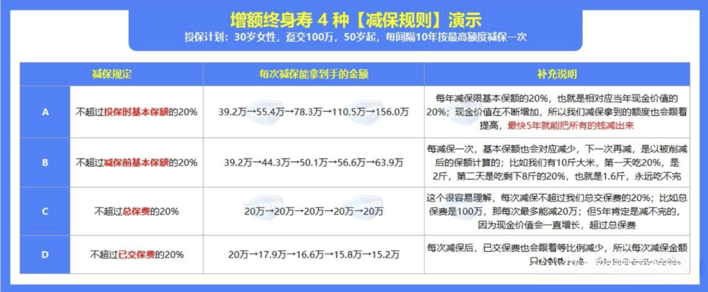 增额终身寿的减保规则一共有 4 种,我也帮大家整理出来了: