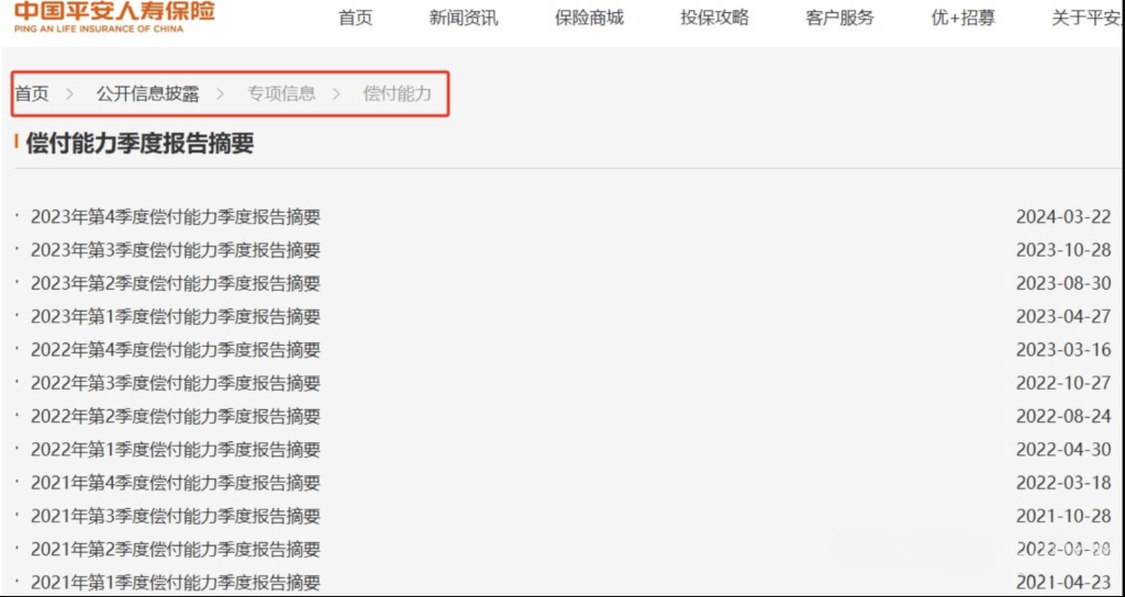 保险公司的偿付能力,我们在保险公司官网上就能找到,例如平安人寿,在首页找到公开信息披露,里面找到专项信息,就能看到偿付能力了,如图: