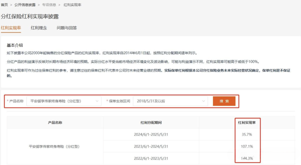 想要了解哪款产品的分红实现率,就在上面输入,然后搜索即可;以平安御享传家终身寿险为例,最低分红实现率是35.7%,最高分红实现率是114.3%。