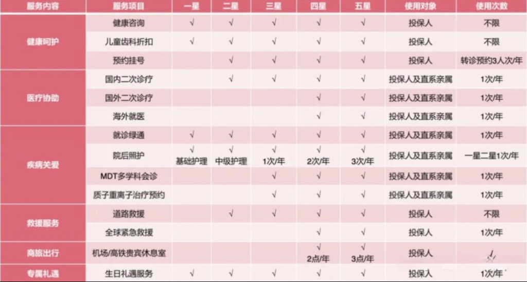 ⑥ 增值服务丰富:投保后,按照不同保费等级,可享受星级增值服务,包含(健康咨询、预约挂号、国内二诊、就诊绿通等),悦养老居家康养服务(康养评估、照护援助等)。