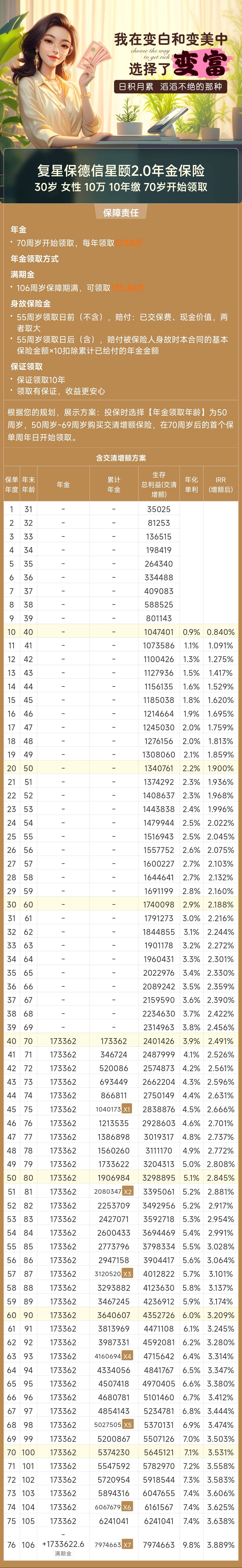 30岁女性,10年缴、每年交10万,50岁开始领取,50-69岁购买交清增额保险,70岁再开始领取,利益演示图如下👇
