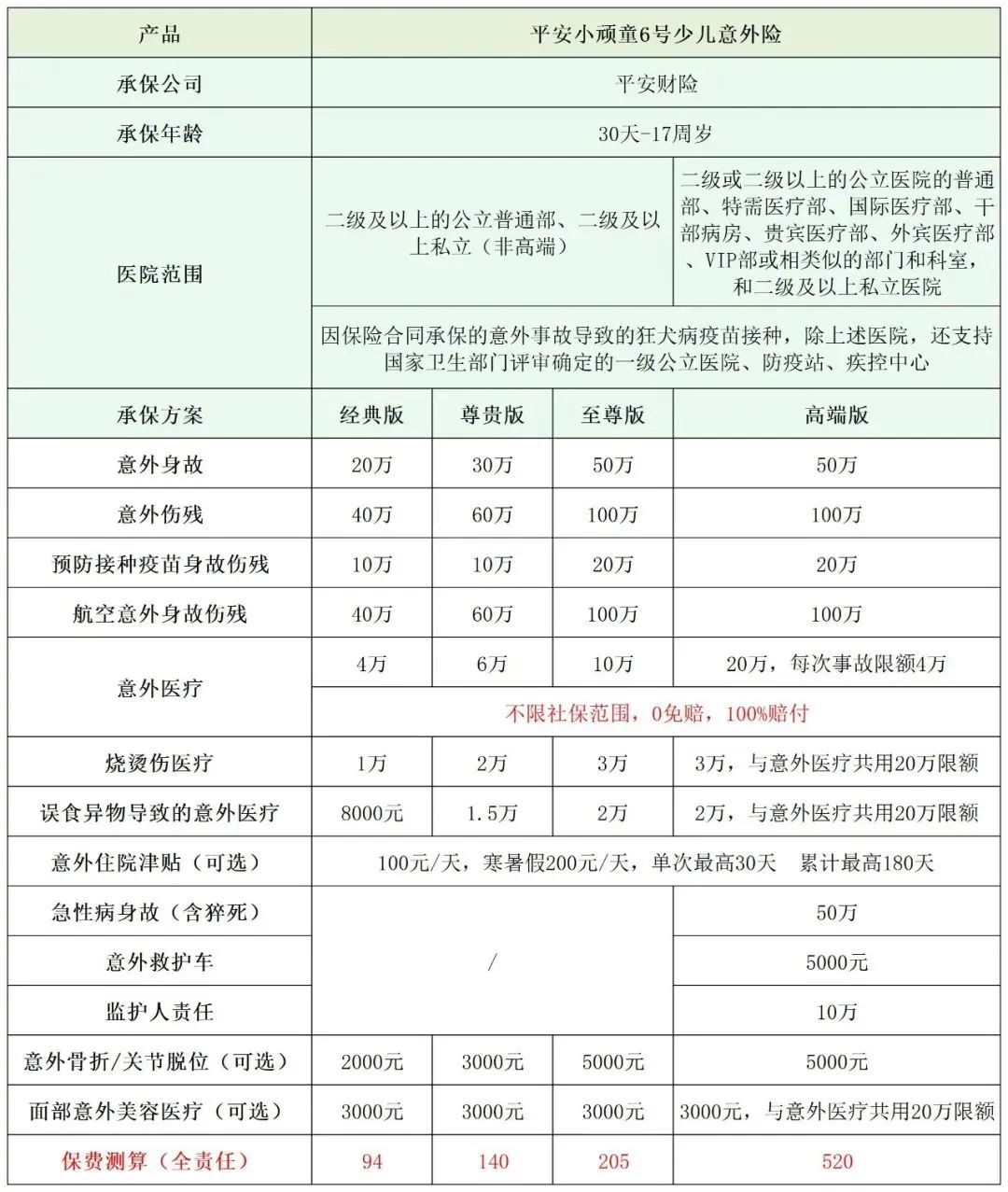 ①平安4-5类职业高意外险(高危版)——无除外医院