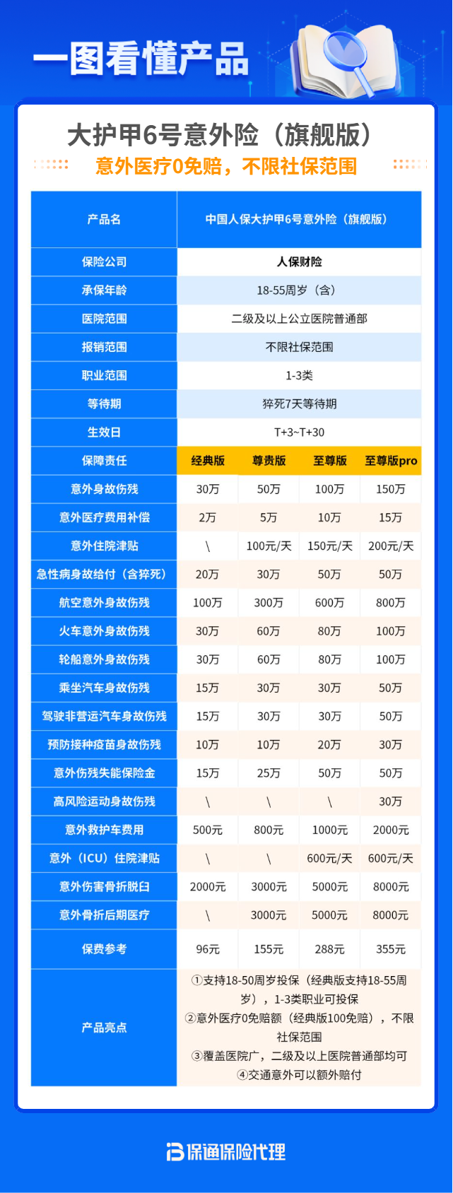 市场第一梯队成人意外险,针对18-60岁人群,提供4个版本自由选择,最低只要100元,性价比真的非常高。它还有3大优势: