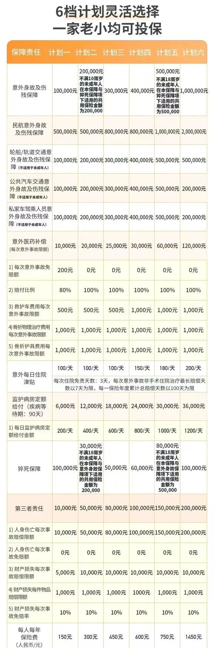 三,保障范围全面:除意外身故伤残、意外医疗、意外每日住院津贴保障外,还包含海陆空交通、驾乘私家车意外,以及猝死、稀缺的第三者责任,保障全面无死角!骨折责任还保骨折护具!