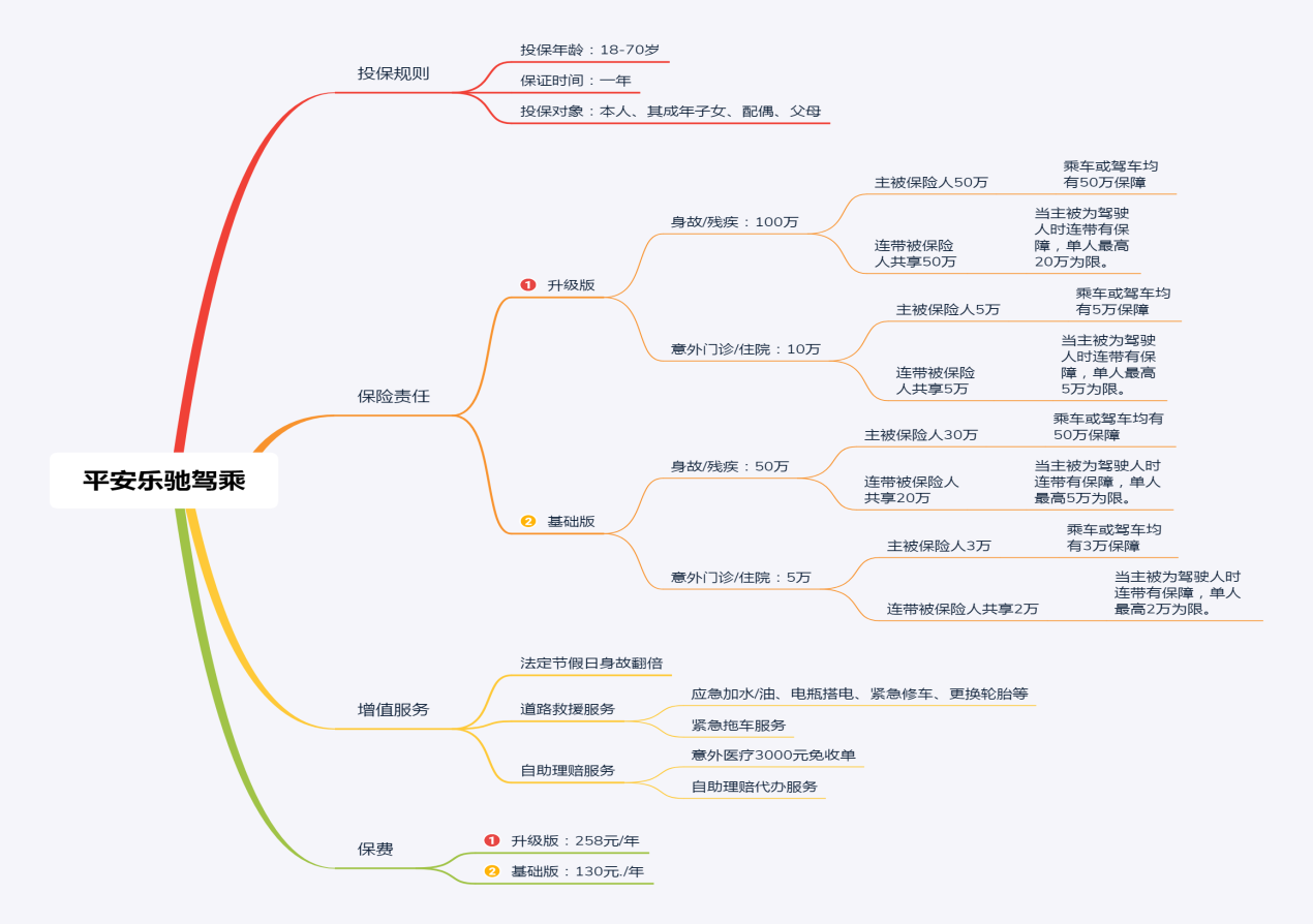 “平安乐驰”有基础款和升级款,升级款设置了100万保障身故/残疾责任,和10万的高额意外医疗,其中驾驶人意外伤害责任定额50万,同车人员共享50万,一般私家车为5座车,坐满四个同车人员,每个人都还可以享12.5万的保障。因此,对于驾驶人和同车人员来说都做到了高保额保障。而升级款每天仅需7毛钱,性价比超高算算就知道。同时,如果你有多辆车,你也不在需要再购买多份驾乘险绑定车辆,只要你拥有“平安乐驰”就够了,既省钱有省心!