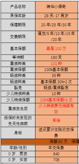 都是良心的少儿高发重大疾病有木有?完全没有包括那种7大姑8大姨都没有听说过的某外文名 III型综合症,只是加一个噱头而已的罕见病。结合之前提到基本保额最高可以做到100万,不得不说瑞华小佩奇的上限很高,在极端情况下能给到极致的保障,木有安全感的家长们可以做到真正的放心了。