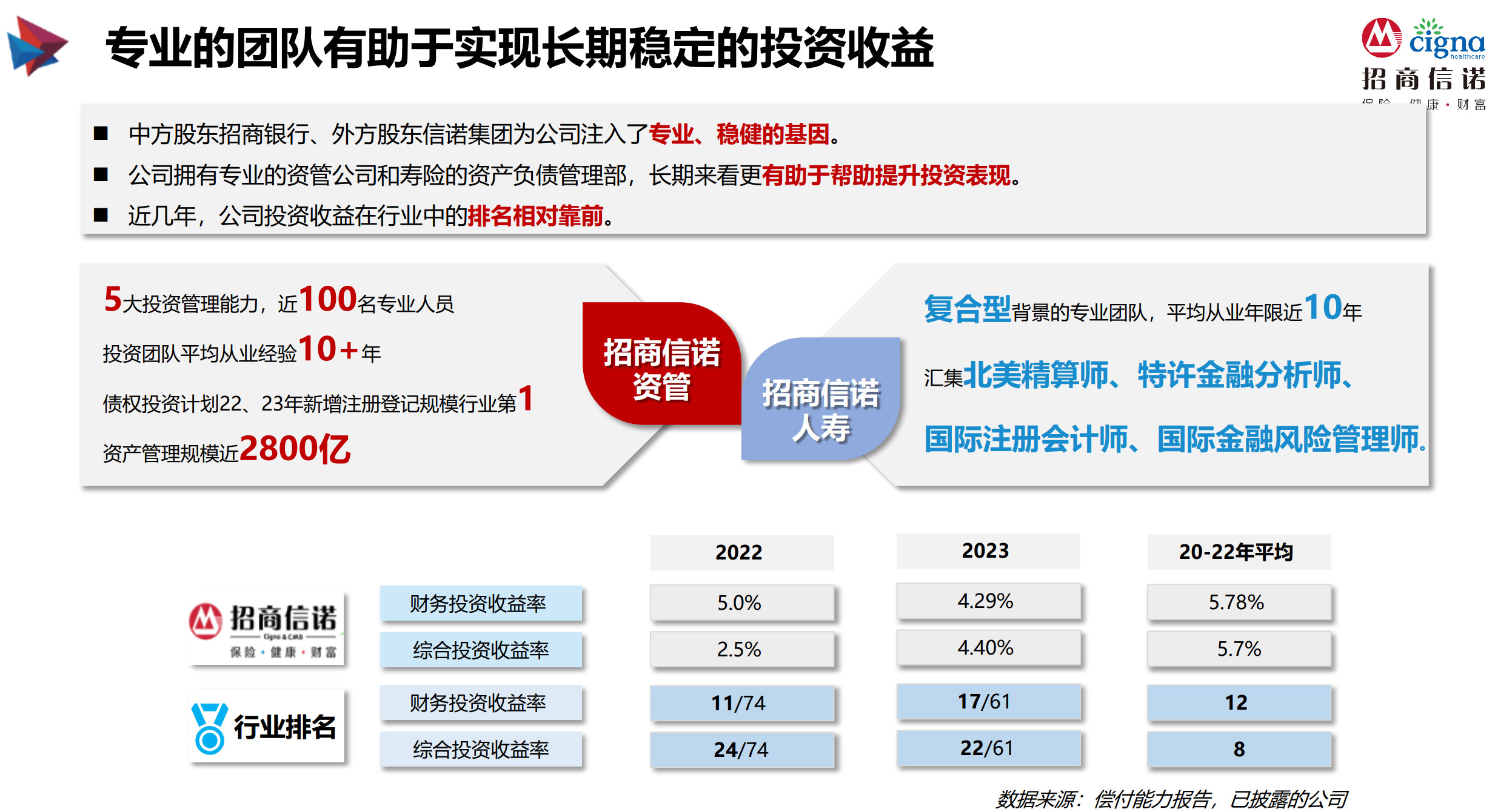作为一家中外合资企业,招商信诺人寿拥有专业的资管公司和寿险的资产负债管理部,长期来看更有助于帮助提升投资表现,从近几年投资收益看,在行业中的排名相对靠前。