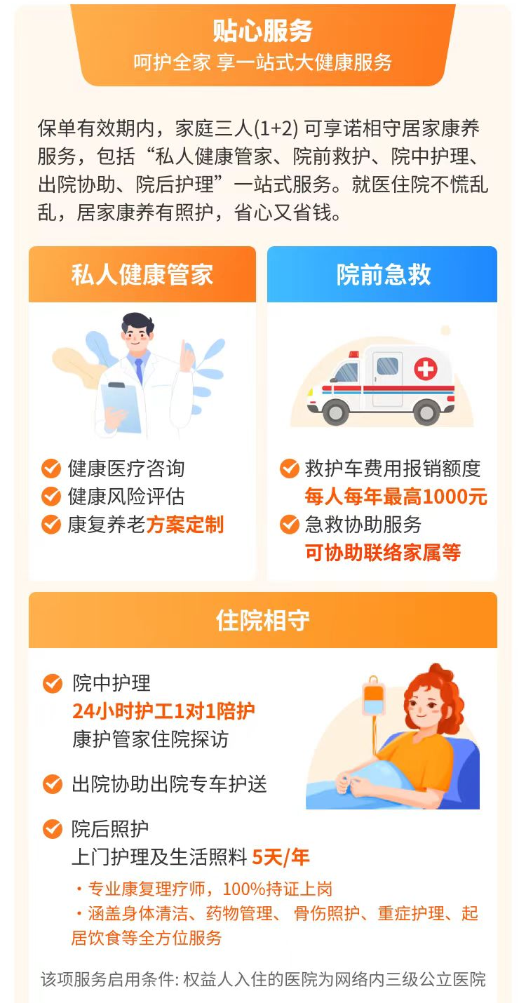 服务内容将近20项,个个都很实用,包括急救协助服务、院内护理、出院协助、院后上门护理&生活照料等等!