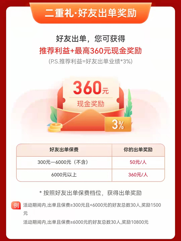 - b. 好友保费大于等于 6000 元,奖励 360 元 / 人。