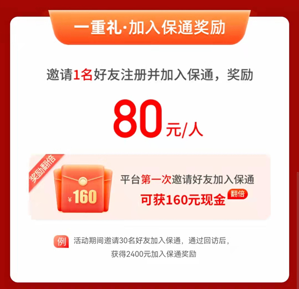 每邀请 1 名好友注册并加入保通,获得 80 元现金奖励,上不封顶!