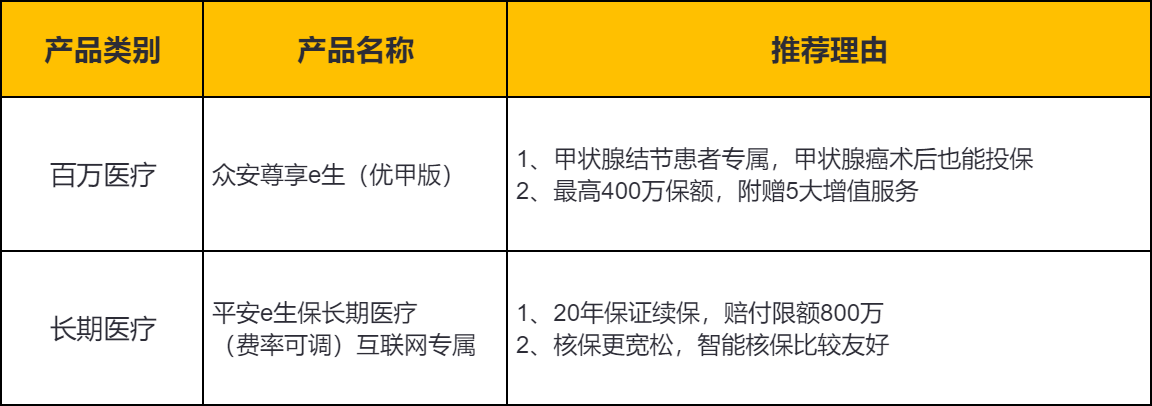有细心的小伙伴可能会发现,为什么推荐的大部分都是百万医疗呢,中端产品责任更好就没有宽松能投的产品吗?其实目前市面上的中端医疗单看健康告知确实要比一些非标友好的百万医疗要略严格一些,但是中端医疗支持智核+人核的核保方式比较多,一般以人核为主,核保结果可能相比较智核会更灵活,而百万医疗基本都是智核的,所以大家有中端的需求也都可以走核保尝试一下哦!