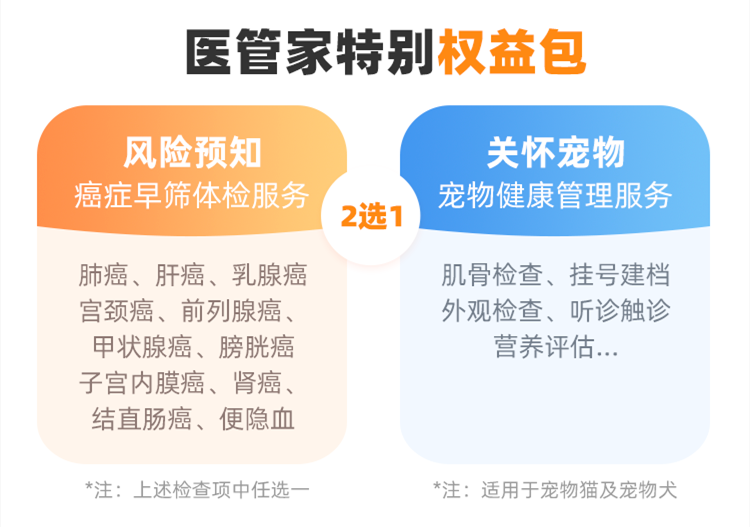 除了保留原有的重疾绿通、住院垫付、术后家庭护理等7项服务外,还新增了慢病无忧、医管家特别权益包(内含癌症早筛及宠物健康管理 2 选 1 服务)等个性化增值服务。