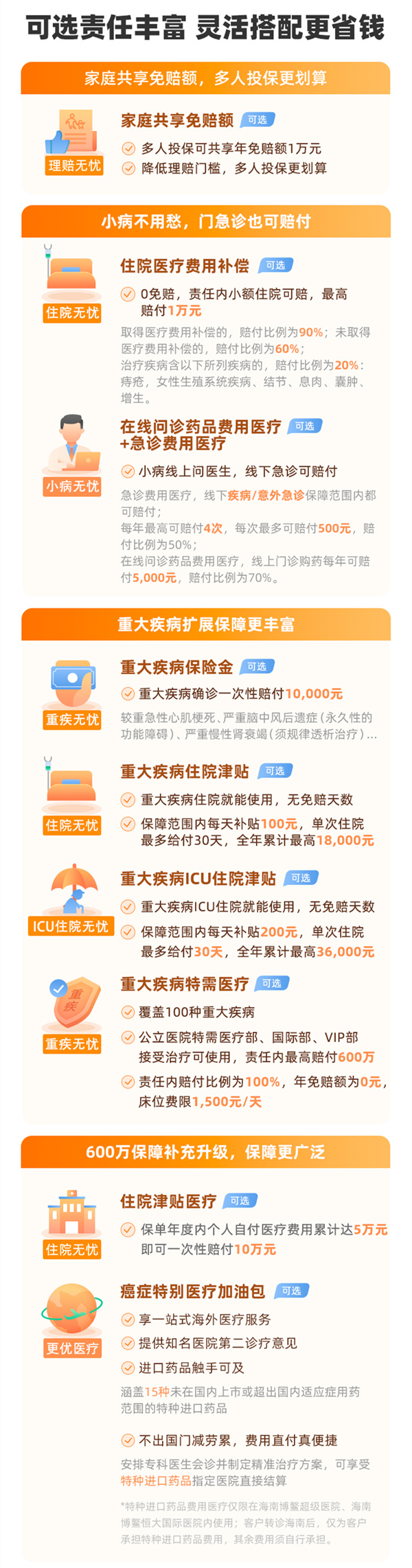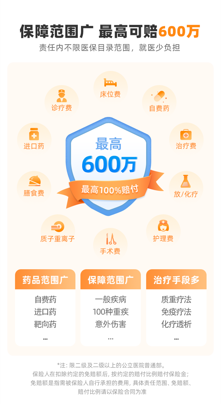 在核心保障上,同样是出生满 30 天 – 70 周岁符合条件的人群都可投保,最高 600 万住院医疗保障,责任内不限医保目录范围,进口药、自费药、靶向药均可报销,还涵盖住院前后门急诊治疗、质子重离子治疗、恶性肿瘤院外特效药等责任。