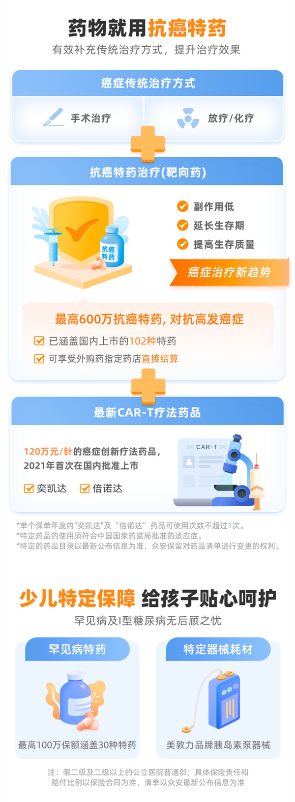但最新版的尊享 e 生 2022,在原先 100 种常规特效药的基础上,新增了 2 种 CAR-T 药品,将恶性肿瘤院外特药清单扩展至 102 种;针对少儿罕见病,也新增至了 30 种少儿罕见病特药。