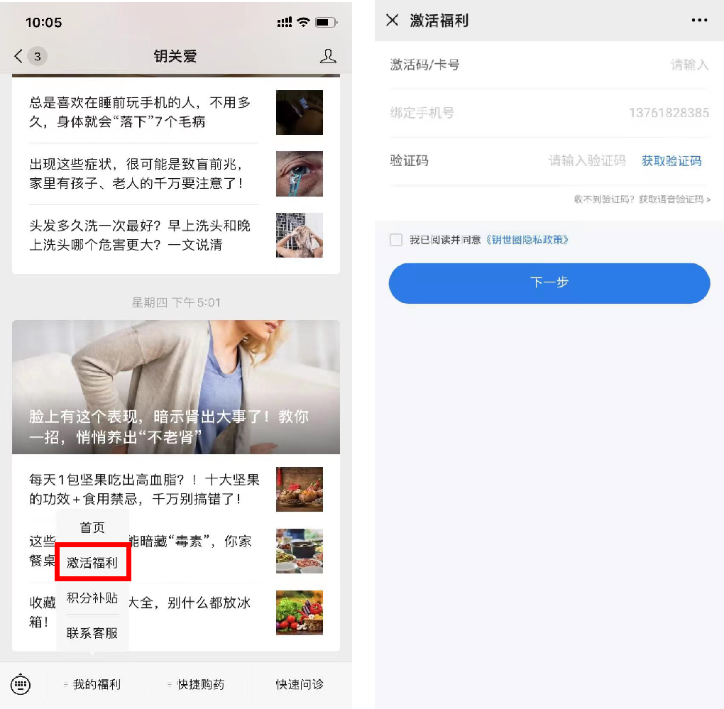 关注微信公众号【钥关爱】,在“我的福利”菜单中,点击“激活福利”。