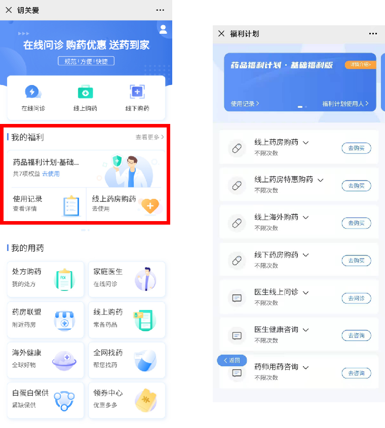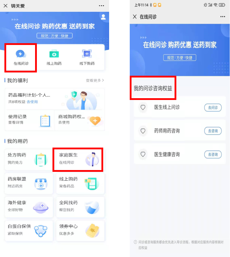 (1)点击“在线问诊”、“家庭医生”,或是在福利计划中点击咨询问诊权益,都可进入在线问诊页面。