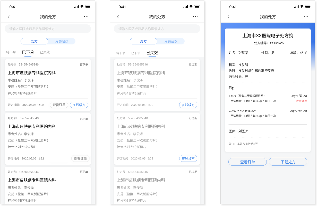 (2)点开具体的处方,即可展示医生开具的处方列表及处方详情。