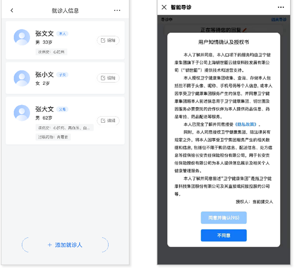 (2)进入在线问诊,选择就诊人,同意用户知情确认书,即可进行问诊。