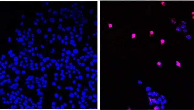 图片来源:希望之城。未经处理的癌细胞(左)和用AOH1996处理的癌细胞(右),右边的癌细胞正在经历程序性细胞死亡(紫色)。