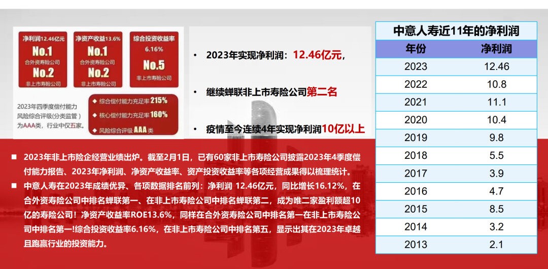 中意人寿已连续11年盈利,2023年成绩表现更是优异,各项数据排名前列:净利润 12.46亿元,同比增长16.12%,在合外资寿险公司中排名蝉联第一、在非上市寿险公司中排名蝉联第二,成为唯二家盈利额超10亿的寿险公司!净资产收益率ROE13.6%,同样在合外资寿险公司中排名第一在非上市寿险公司中排名第一!综合投资收益率6.16%,在非上市寿险公司中排名第五,显示出其在2023年卓越且跑赢行业的投资能力。