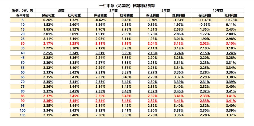 如果分红实现率能达到100%,无论是趸交、3年交、5年交还是10年交,加上预期红利,长期利益都能达到3.4%以上,吊打市场上任何一款普通型增额终身寿。