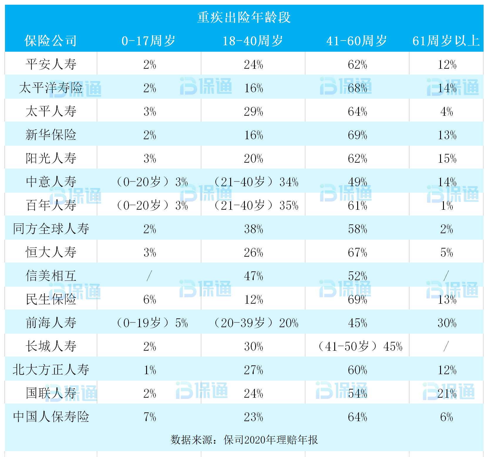 重疾出险年龄段集中在41-60岁,最迟在40岁之前配置重疾险;