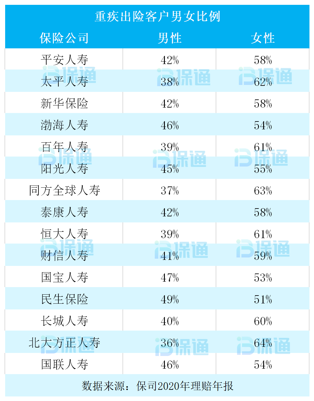 而从重疾理赔客户男女比例看,女性出险概率更高,比男性高出10%左右。广大女性朋友们一定要提高警惕,别总忙着为孩子、配偶、老人买保险,你更需要一份高保额的长期重疾保障。