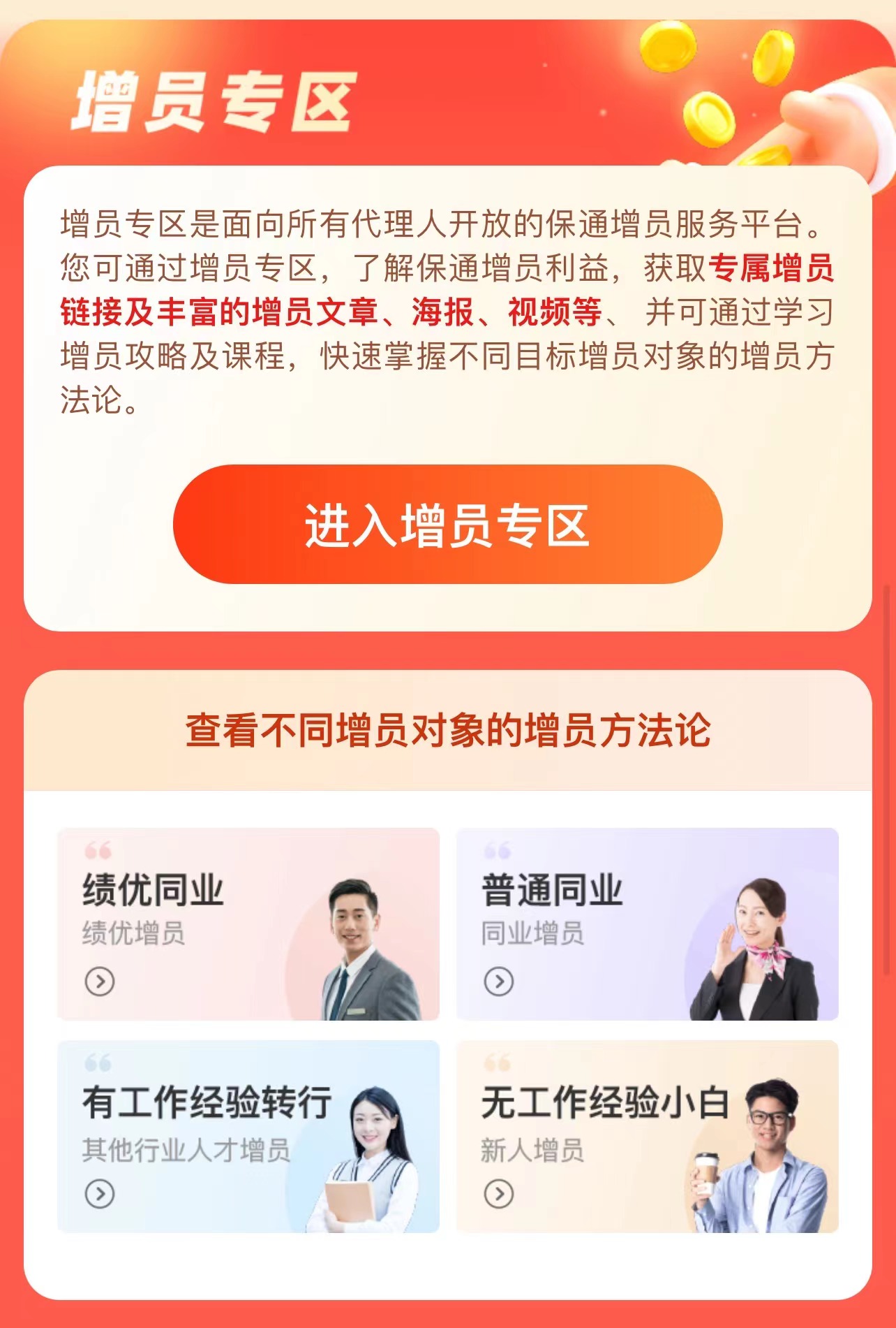 另外,为了帮助老师们更好地增员,我们还特别开辟了【增员专区】板块(← 点击左边蓝字直达),里面有针对性不同人群的增员素材,可供老师们一键转发使用。