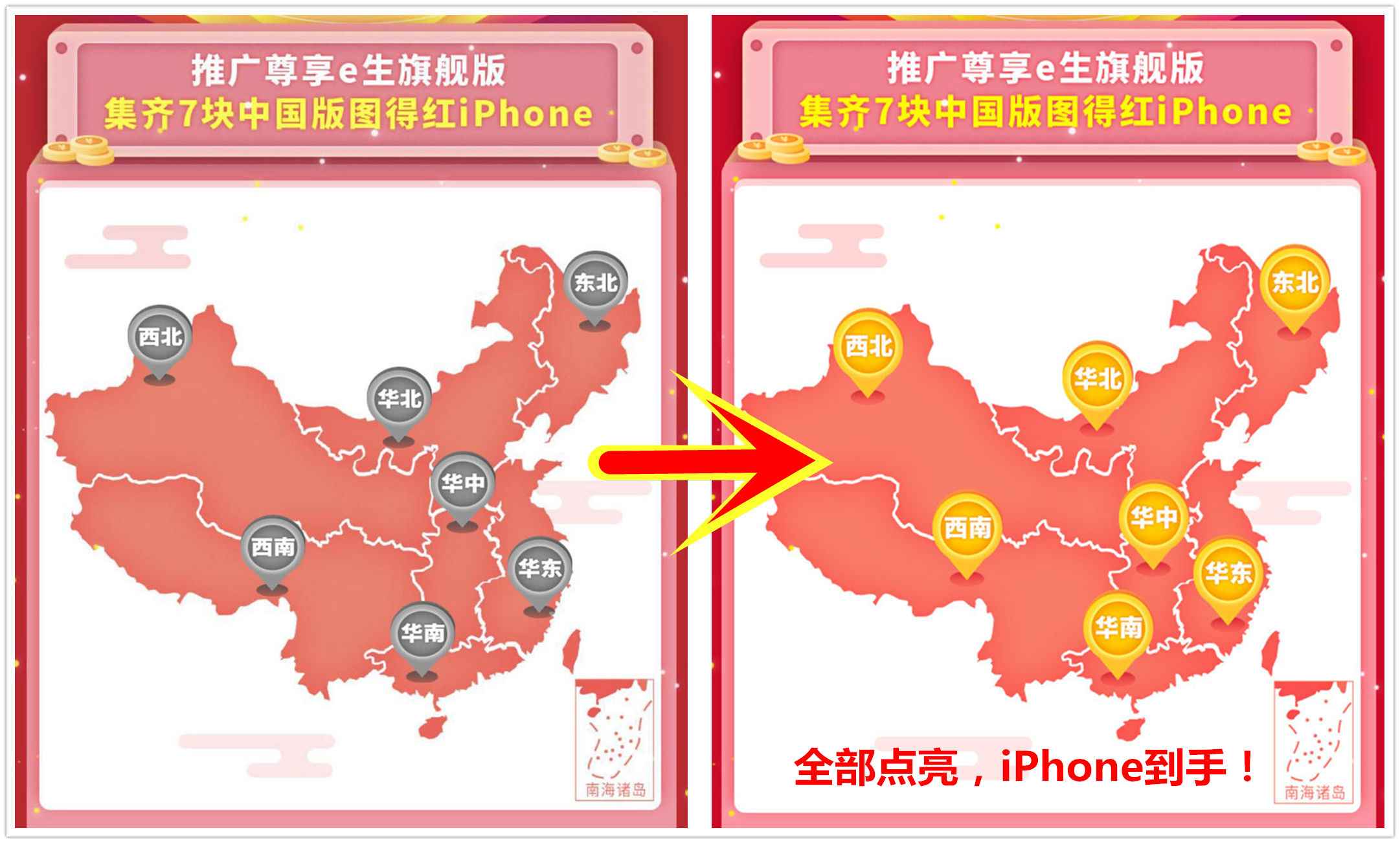 同时,可获得一块【拼图】。拼图有东北、华北、华中、华东、华南、西北、西南共7种。每收集到一种拼图,就能够点亮中国地图上的相应区域。