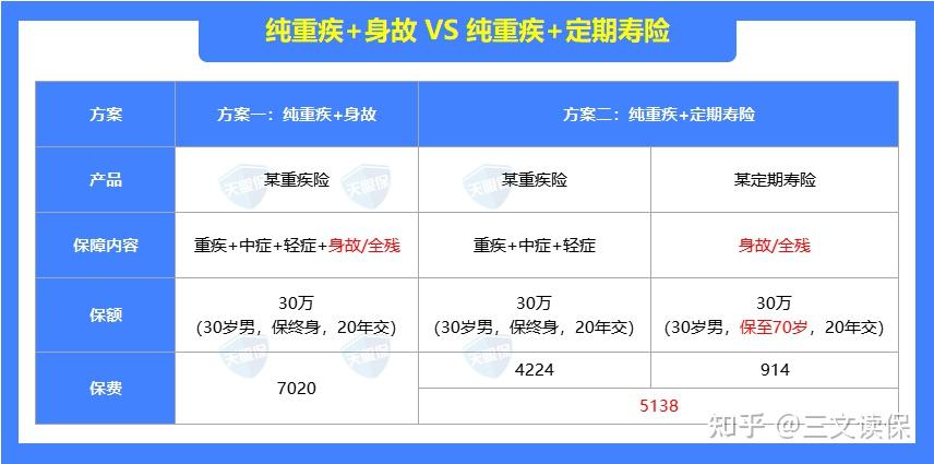 总之,买重疾险时,优先买纯重疾,需要身故责任的,去另外购买一份定期寿险,这才是保险内行人最经济划算的买法。