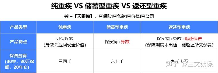 根据不同的保障形式,重疾险大致分为三类:“纯重疾、储蓄型重疾、返还型重疾”。