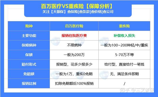 可以看到,百万医疗险和重疾险的功能压根就不一样,百万医疗险是报销性质的,住院医疗费花多少报销多少;而重疾险是给付性质的,如果达到保险合同约定的疾病,就能一次性赔我们30万、50万或其它。