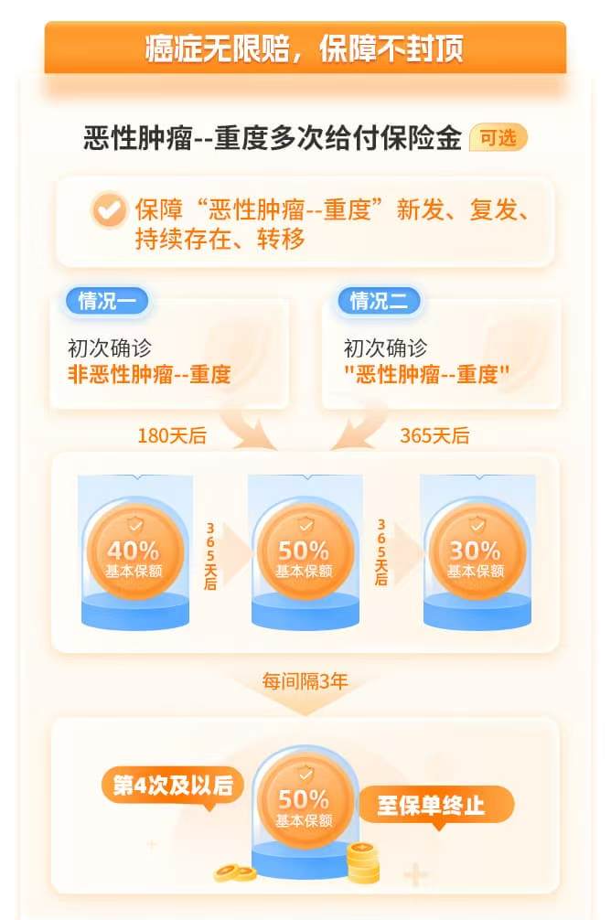 2.恶性肿瘤-重度多次给付保险金:此项责任相当于“癌症无限次赔”,前三次和【恶性肿瘤-重度医疗津贴保险金】一样,第4次及之后每次赔付50%保额,每次间隔期不少于1095天。