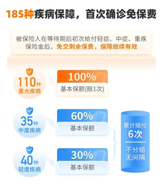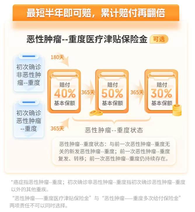 1.恶性肿瘤-重度医疗津贴保险金:首次确诊为恶性肿瘤-重度,间隔365天、365天、365天,分别给付40%、50%、30%保额;首次确诊为非恶性肿瘤-重度,间隔180天、365天、365天,分别给付40%、50%、30%保额。