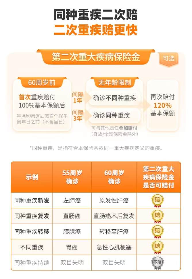 延续超级玛丽9号的保障,10号可选重疾二次赔,无论是同种重疾还是非同种重疾,都可以2次理赔,但要满足一个标准:首次重疾确诊时间,必须在60岁之前,否则重疾二次赔自动失效。