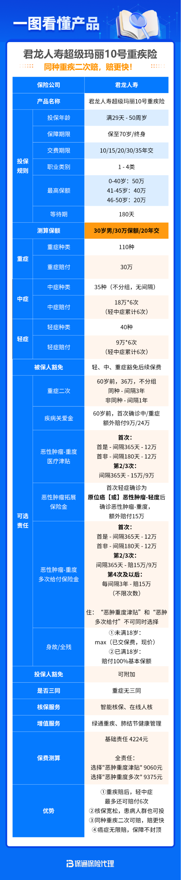 如果您还缺少重疾保障,可以重点看看超级玛丽10号!对产品感兴趣的话,可向您身边的保通代理人咨询了解~