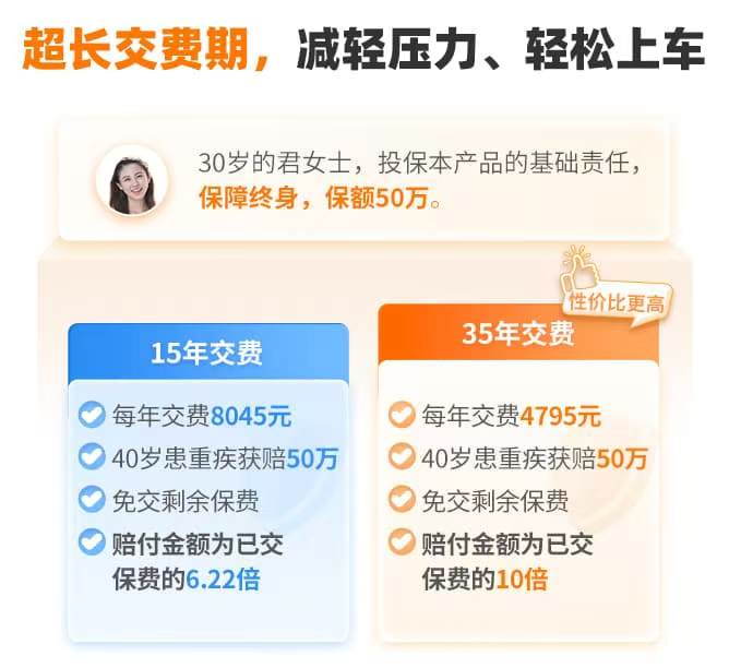 超级玛丽10号保障期间可选至70周岁、保终身,缴费期除10、15、20、30年缴之外,最长支持35年缴,可大大减轻每年的财务压力,买到更高的保额。