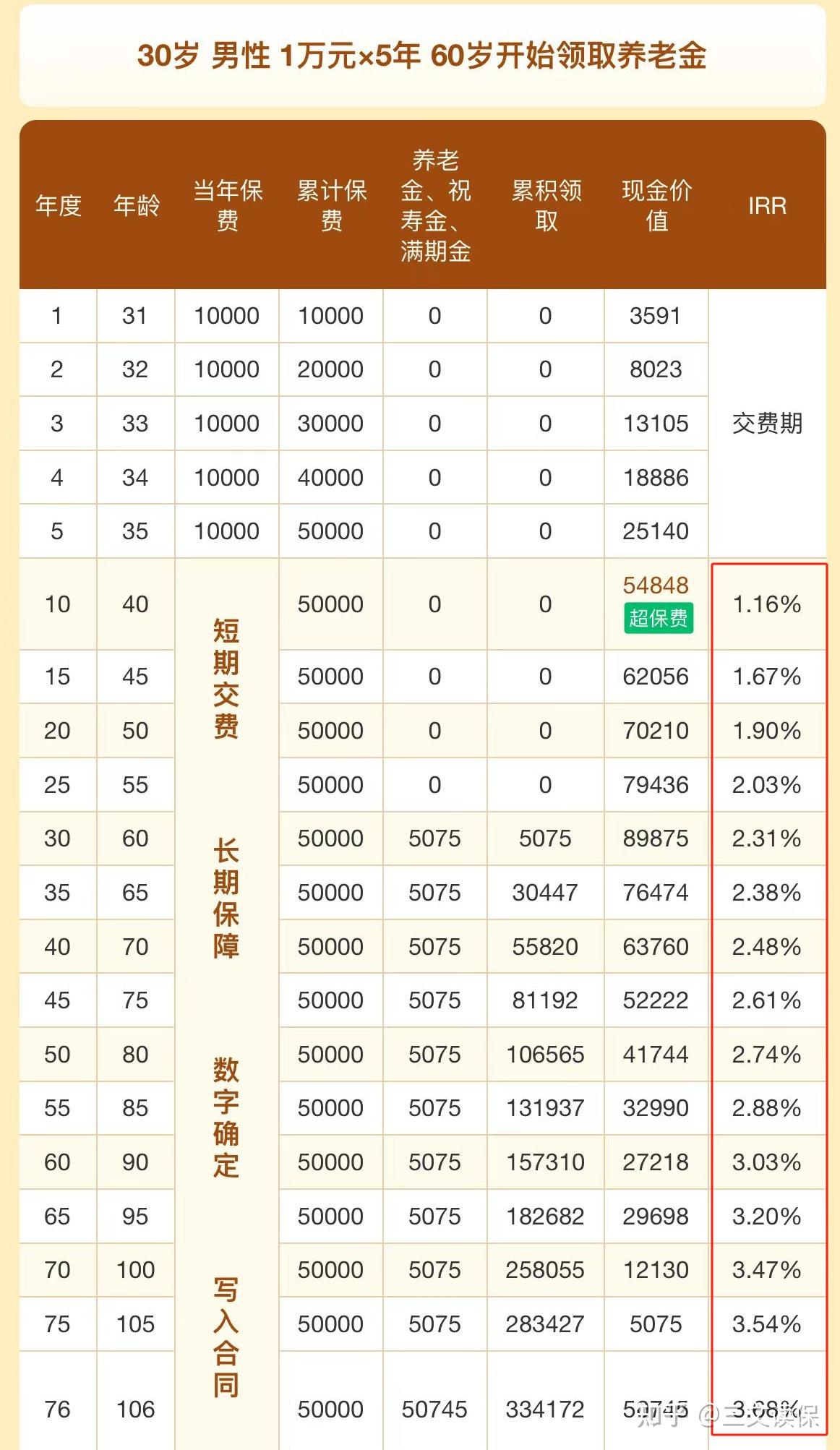 除了简单粗暴的对比养老金领取金额和身故能拿到的金额之外,我们还能对比它的内部收益率IRR,如果有投资习惯的朋友,应该对这个术语并不陌生。