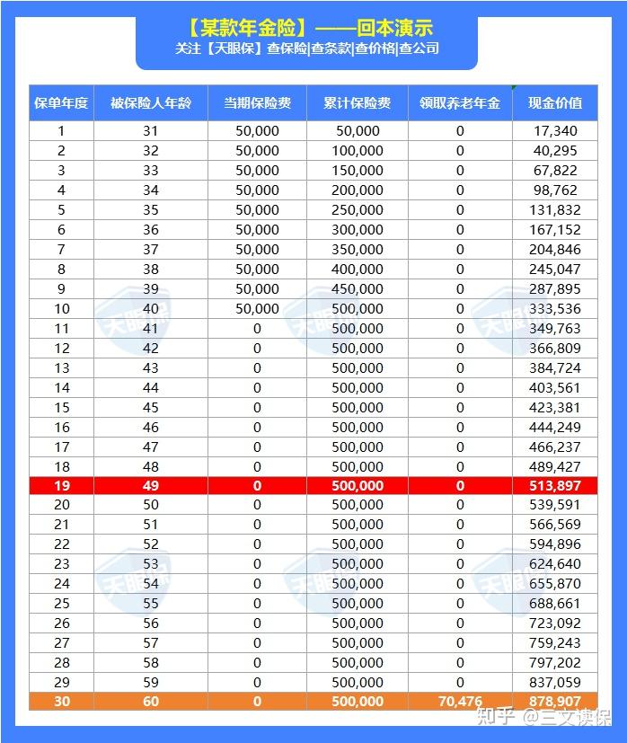 可以看到,直到49岁,也就是保单第19年,保单的现金价值才能超过已交保费;所以,同样也就意味着,在前19年要是动这个养老金账户,都是有损失的。