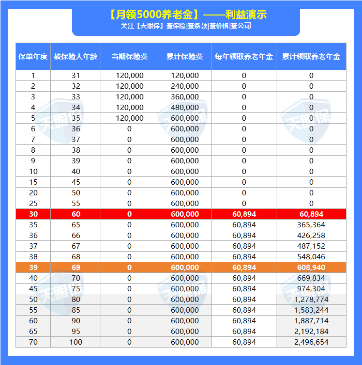 资金增长速度跟上面几乎持平,反正只要你活着,每年就能领回60894元。