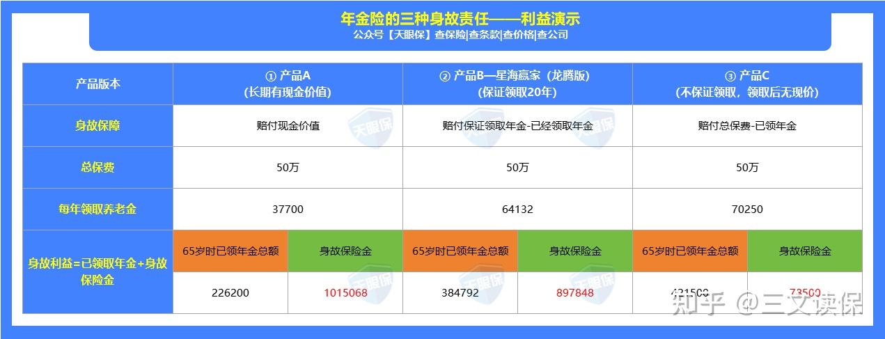 ①A产品虽然每年领钱最少,但如果65岁身故,还有1015068的现金价值可以一次性给付,总共赔到1241268。