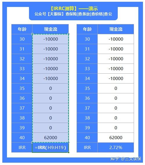 计算方式很简单,只要在excel表内输入两列:①保单年度/年龄,②现金流;输入IRR公式“=irr”按回车键,框选现金流,再按回车键,就能算出IRR。