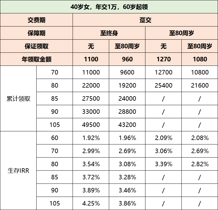 也就是说,如果是40岁开始领取,选择1/3年缴,最大投保年龄是35周岁,要是10年缴,最大投保年龄是30周岁。