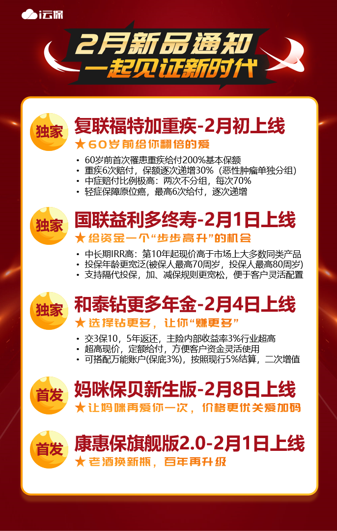 提前预告!春节前5大新品来袭,个个都是王炸由 baoxianshi2025年11月12日赶在春节之前,一大波好险来袭! 3款独家、2款首发,其中包括3款新定义重疾险,它们前身个个都是市场爆款! 产品基本形态抢先放送! 一、复联福特加重疾-2月初上线 二、康惠保旗舰版2.0—2月1日上线 三、和泰钻更多年金—2月4日上线 四、妈咪保贝新生版-2月8日上线 更多产品详情,敬请期待~~ 标签:妈咪保贝康惠保旗舰版重疾险 发表回复 取消回复您的邮箱地址不会被公开。 必填项已用 * 标注显示名称 * 邮箱 * 网站 评论 * 在此浏览器中保存我的显示名称、邮箱地址和网站地址,以便下次评论时使用。